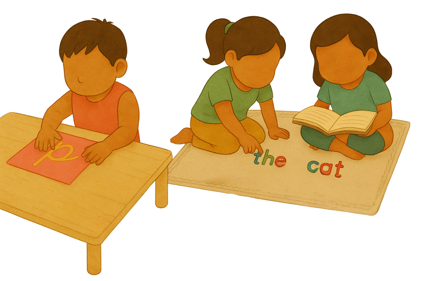 The Montessori language programme is phonetics-based and offers a clear, logical path into reading and writing. Children are supported in expressing their thoughts freely, and the classroom encourages a non-corrective, creative approach to writing.