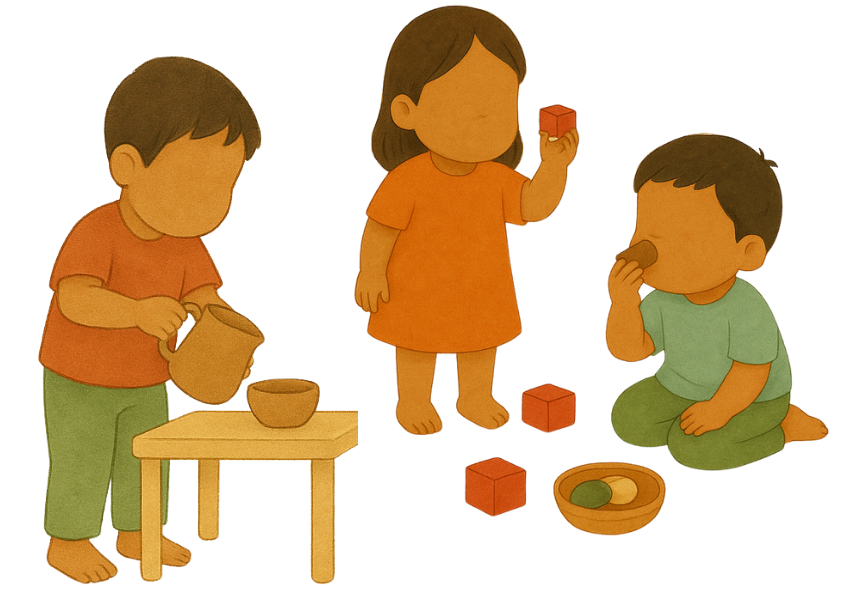 These activities reflect the daily work children see at home — pouring, sweeping, dressing, and caring for the environment. Practical Life builds independence, coordination, concentration, and the ability to complete a full cycle of activity.